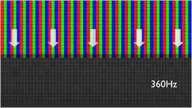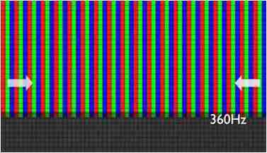 传统液晶驱动是从左到右单向进行,,,在画面更新速度愈来越愈快的情况下,,,位于驱动线路末端的右下角区域,,画素的闸极来不及在短时间内获得足够电压,,,,无法显示出正确的颜色资讯。。 |