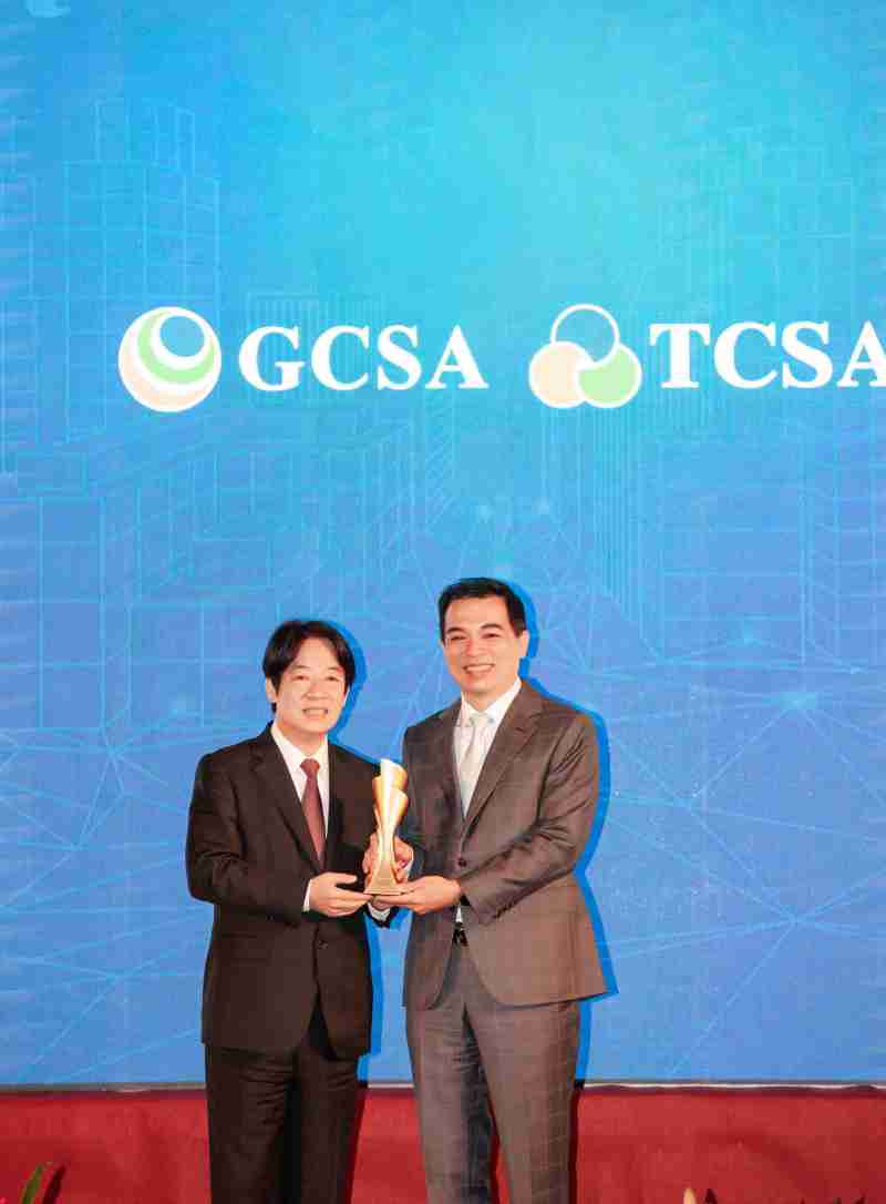 达全方位永续表现获全球永续奖及台湾永续奖肯定,,由副总统赖清德颁奖 (左),,赏金国际总经理柯富仁 (右) 代表领奖